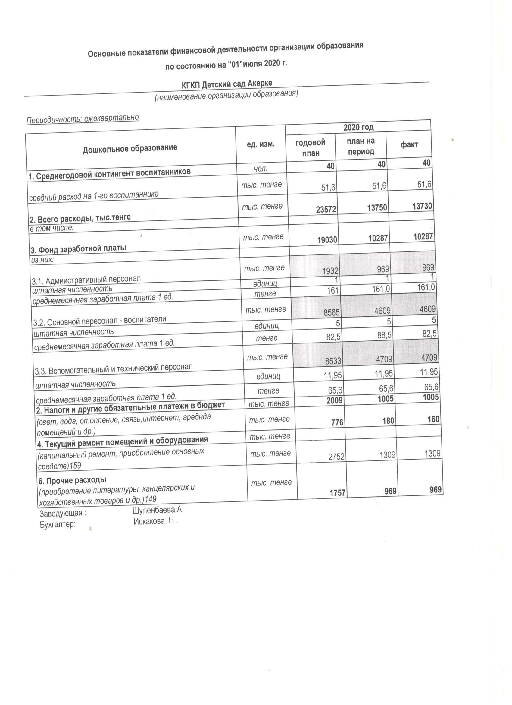 Основные показатели финансовой деятельности за 2 кв 2020 » Жамбыл облысы Шу ауданы әкімдігінің білім бөлімінің “Ақерке” балалар бақшасы” коммуналдық мемлекеттік қазыналық кәсіпорны